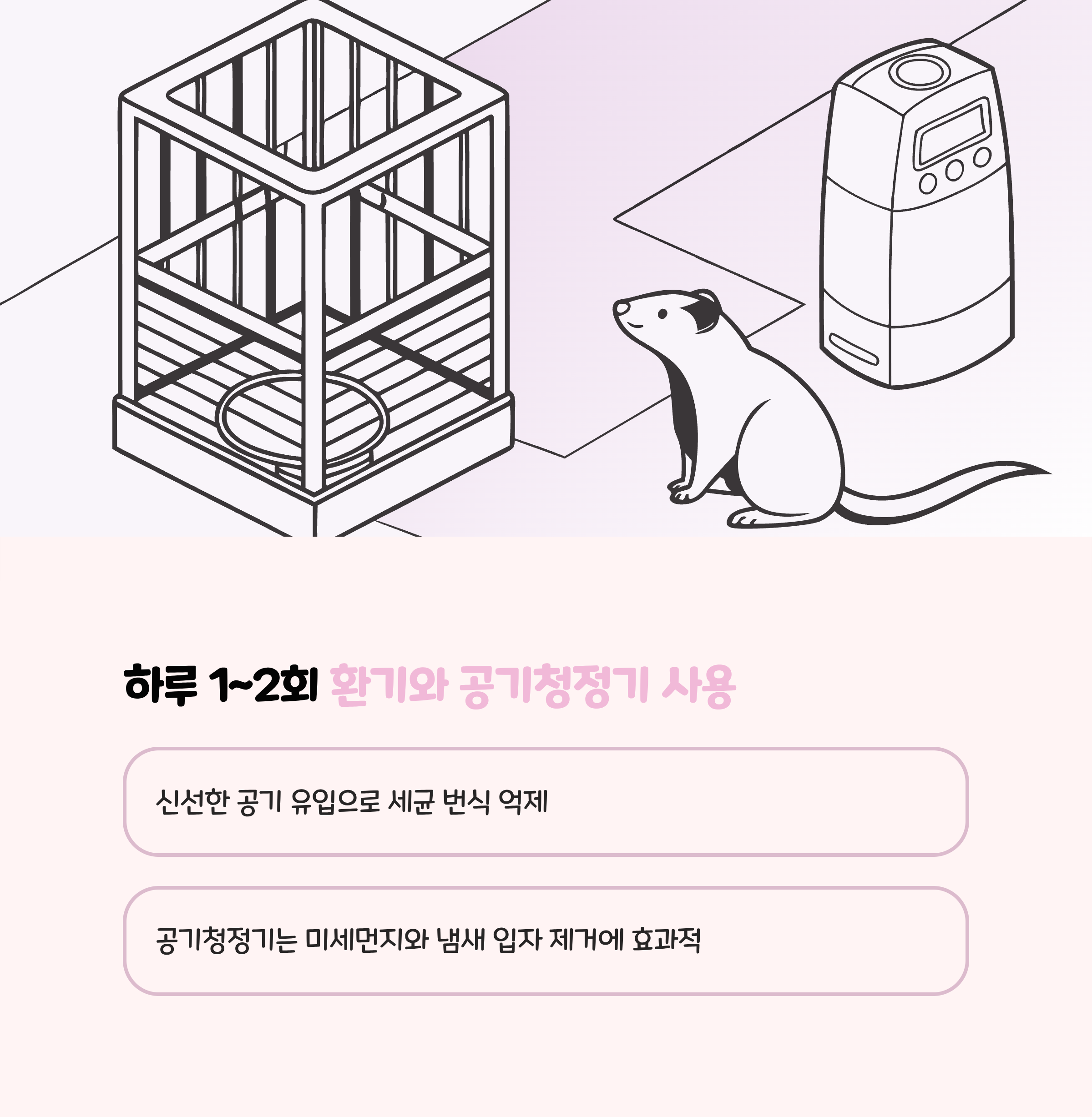 | 환기 및 공기청정기 | 하루 1~2회 환기, 반려동물 필터 장착 공기청정기 활용 |