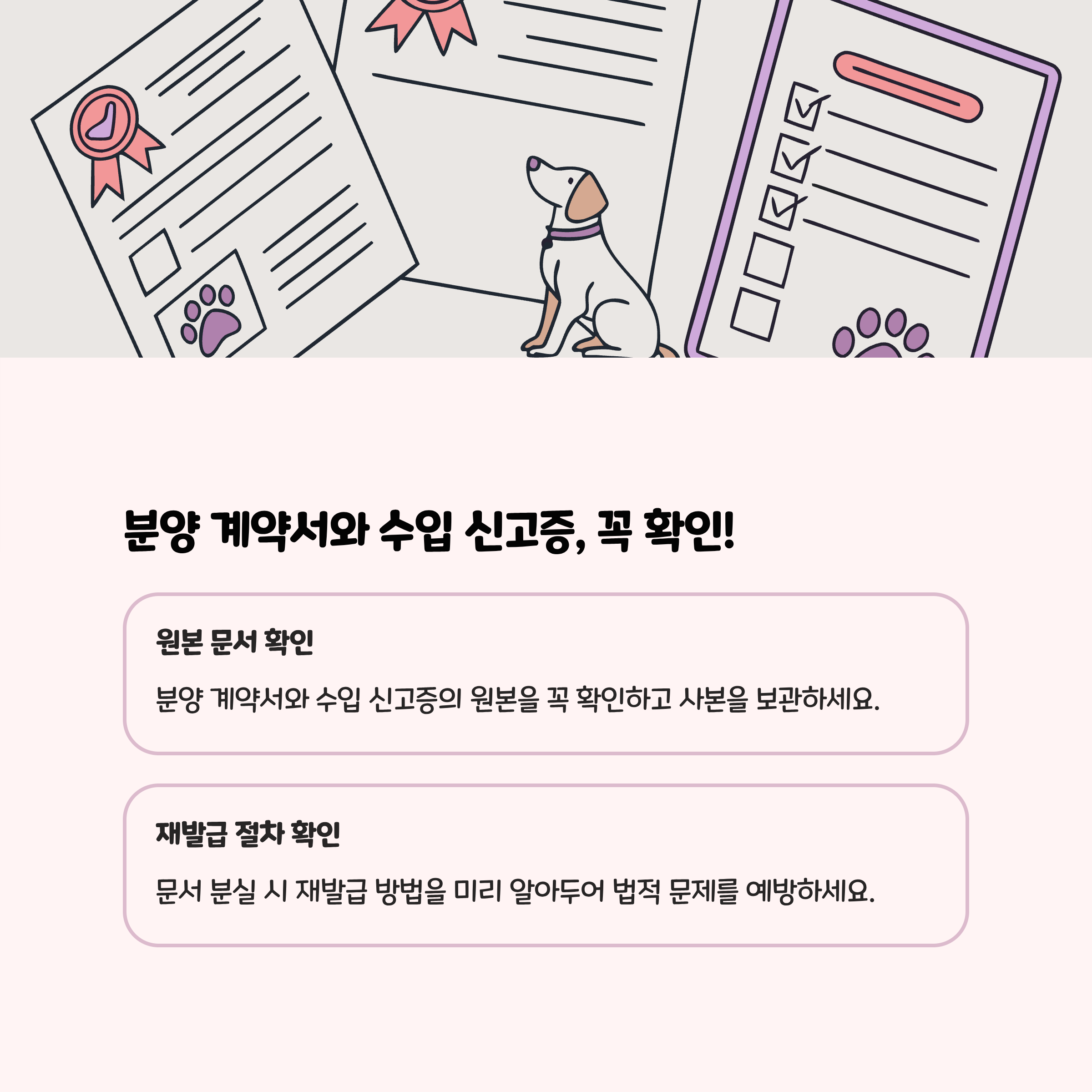 | 믿을 수 있는 분양처 확인 | 분양계약서, 수입신고증 | 브리더/펫샵/보호센터 등 공식 경로 활용 |
