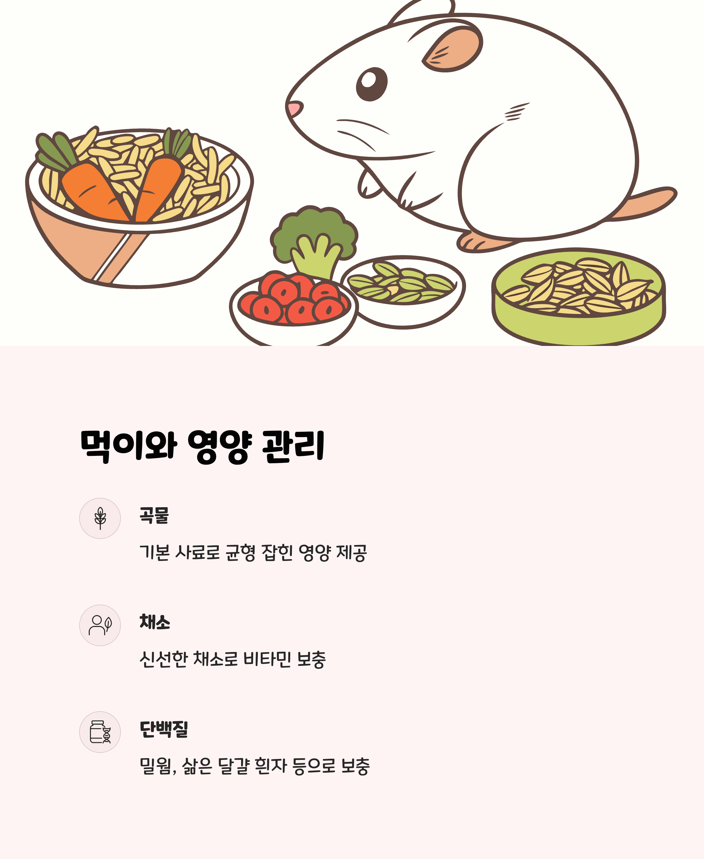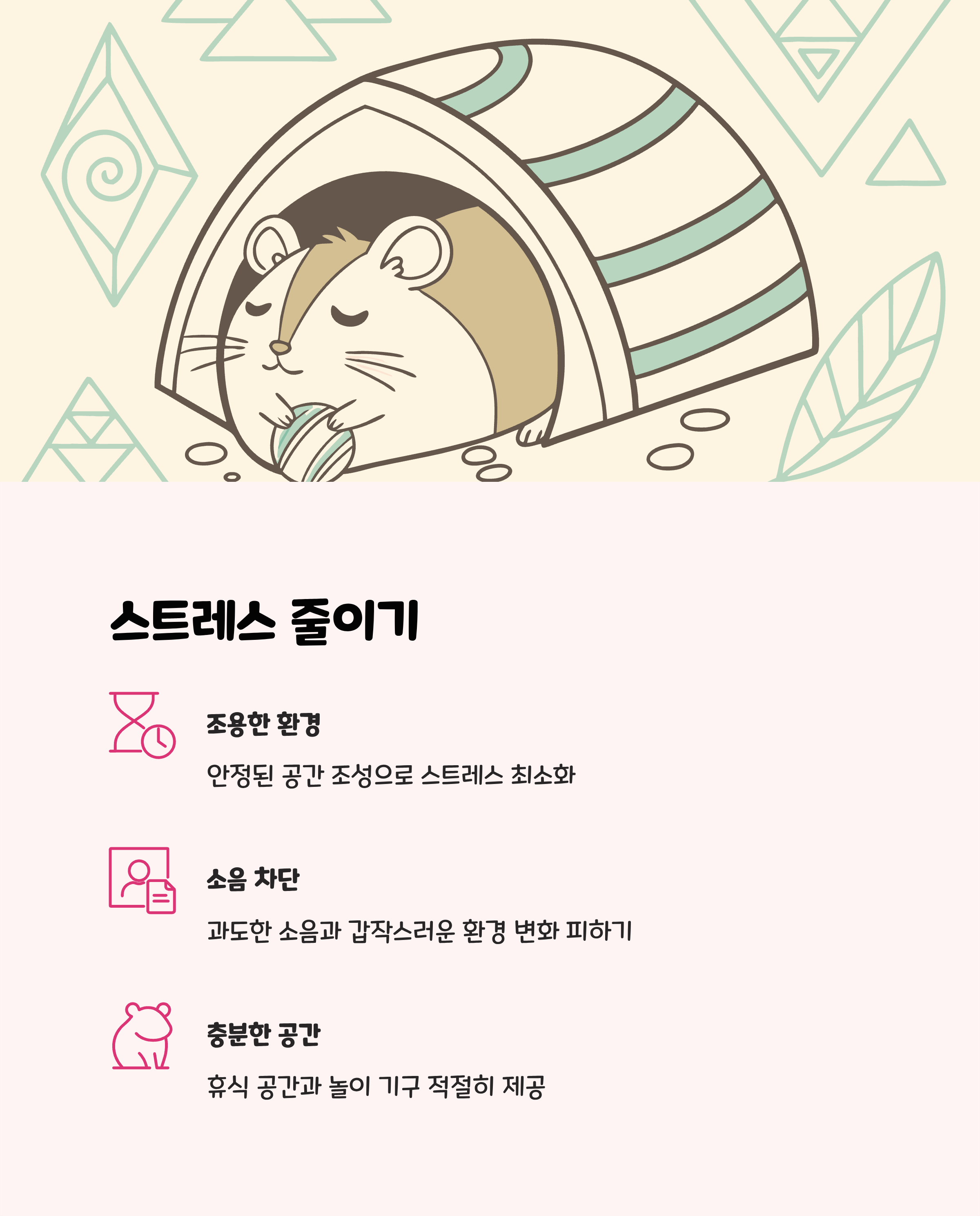 • 운동과 놀이 제공: 햄스터 바퀴나 터널 등 적극적 활동 공간 마련해 활력을 유지.