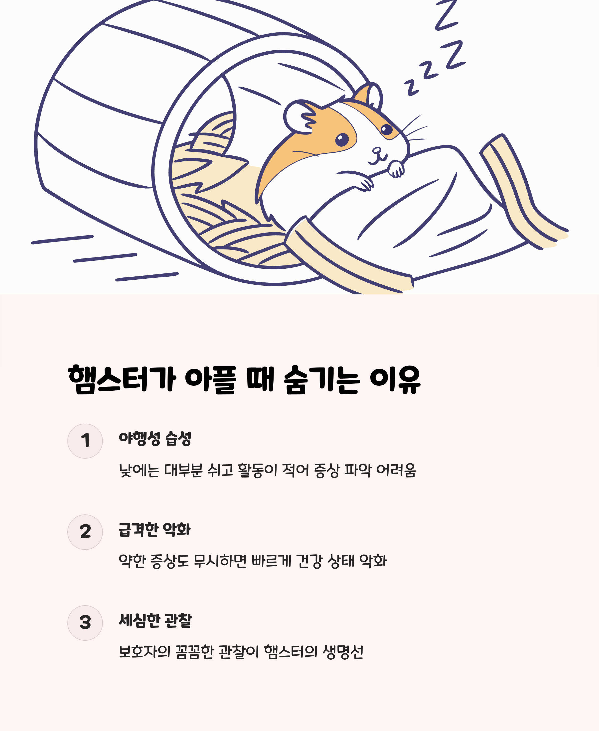 반려 햄스터가 보이는 작은 행동 변화도 건강 이상 신호일 수 있으므로 세심한 관찰과 빠른 조치가 필요합니다. 집에서 가능한 기본 관리와 더불어 병원 방문 시점도 놓치지 마세요. 소중한 햄스터가 건강하고 오래 행복할 수 있도록 예방과 대처에 힘써주시길 바랍니다.