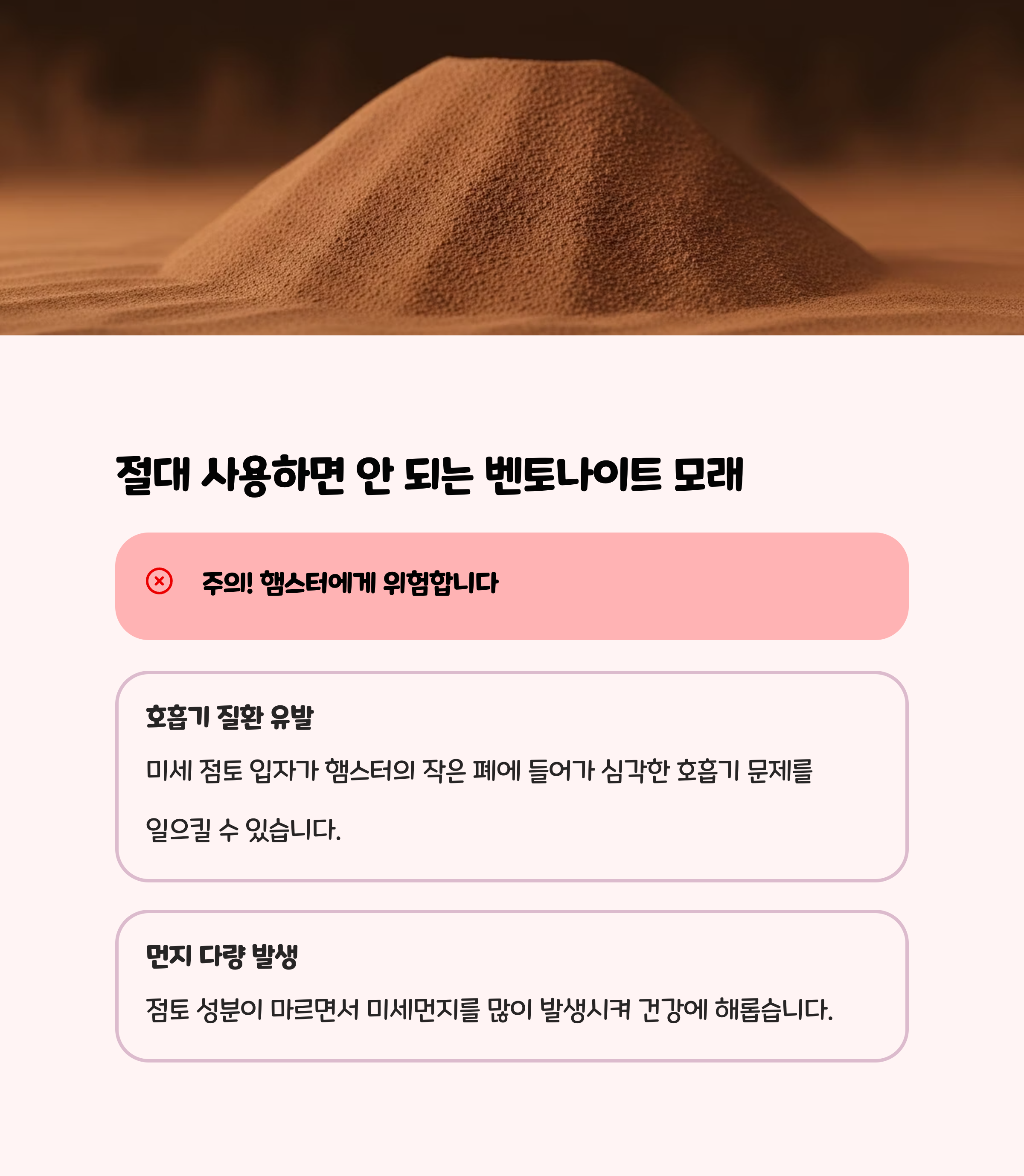 | 졸리 햄스터 목욕모래 | 인공향 모래 | 탈취 기능, 다양한 향 | 인공향, 장폐색 위험 |