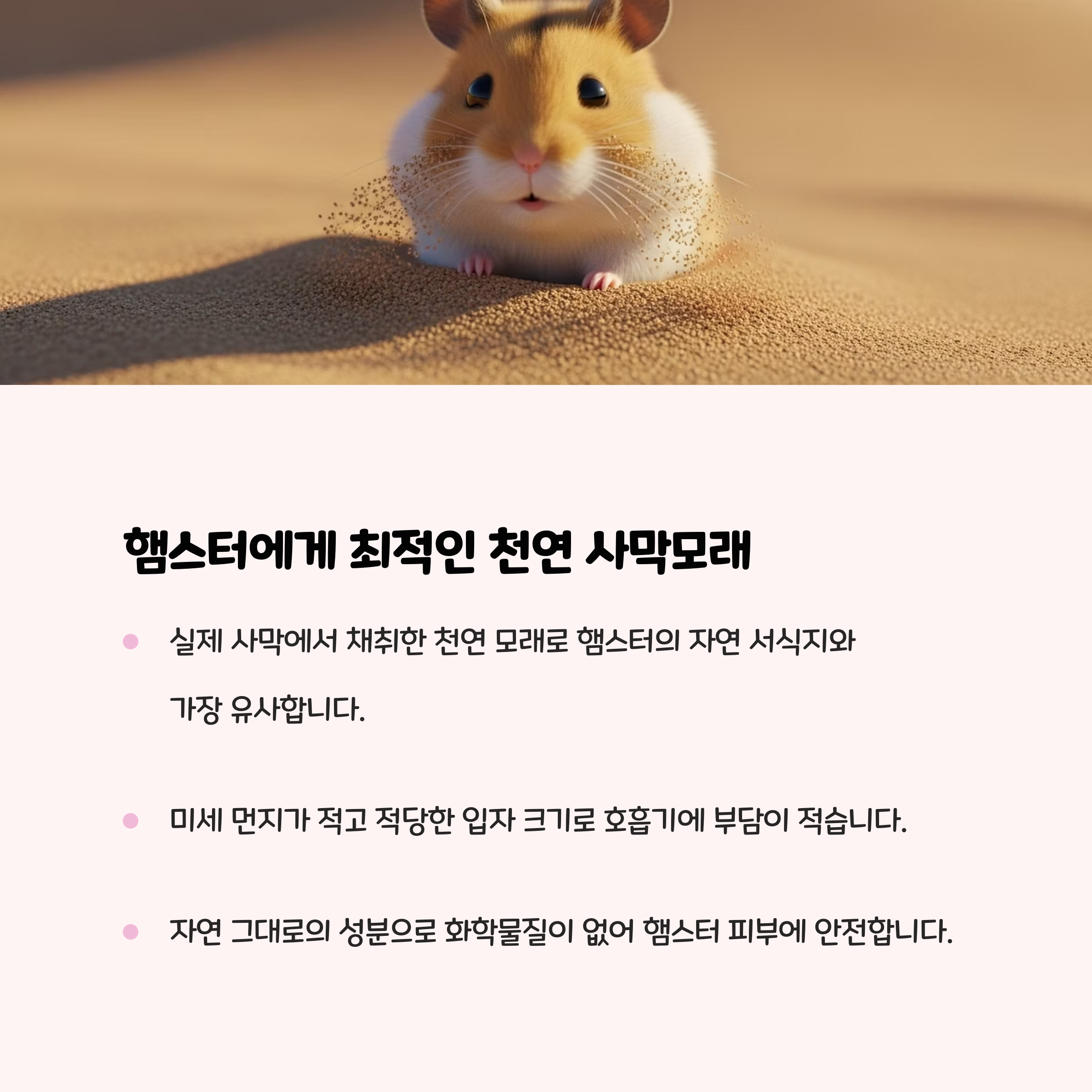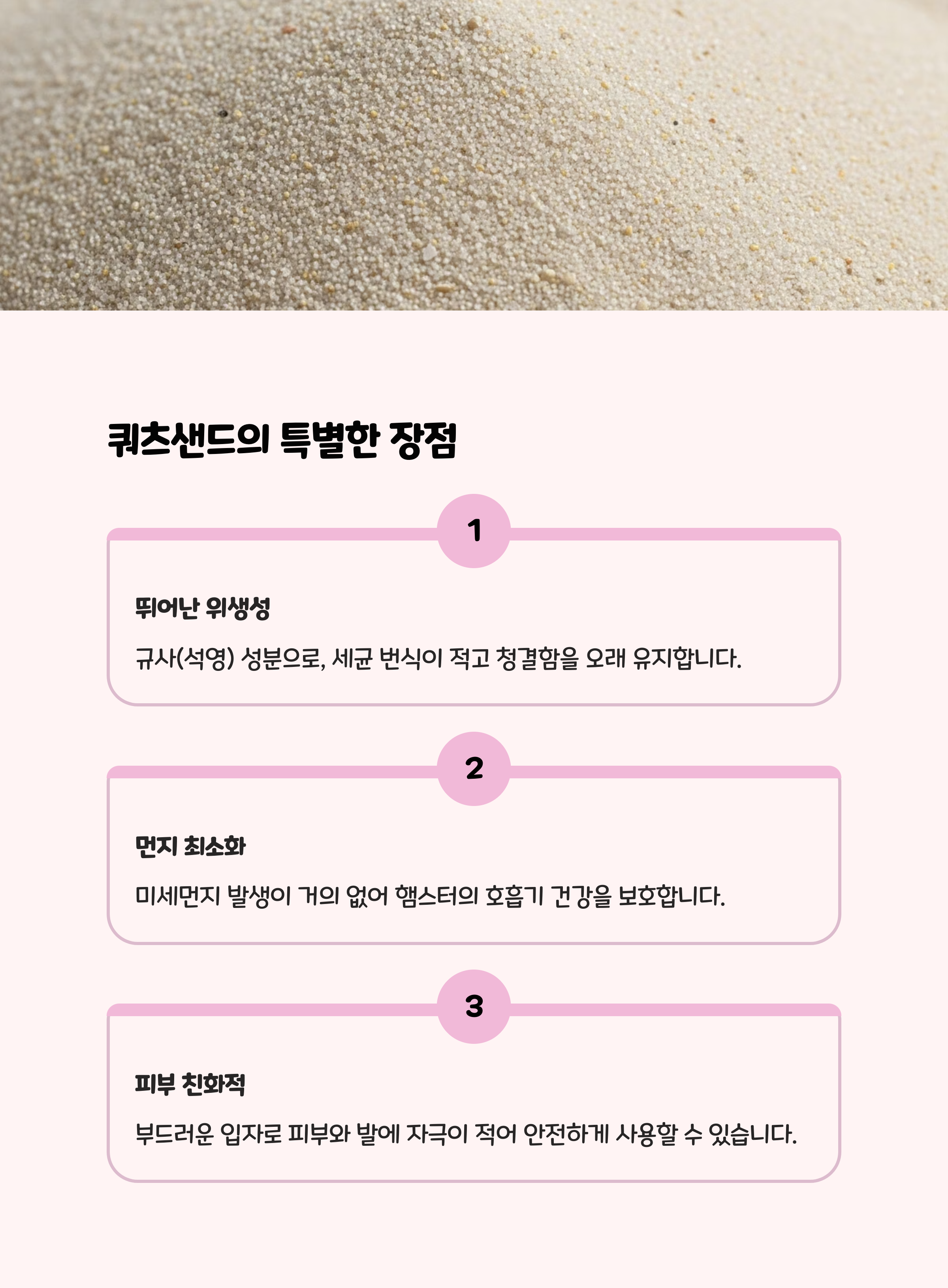 장점: 천연 모래로 분진이 적고, 입자가 굵어 먼지 발생이 적음.단점: 일부 햄스터는 입자가 굵은 모래를 선호하지 않을 수 있습니다.