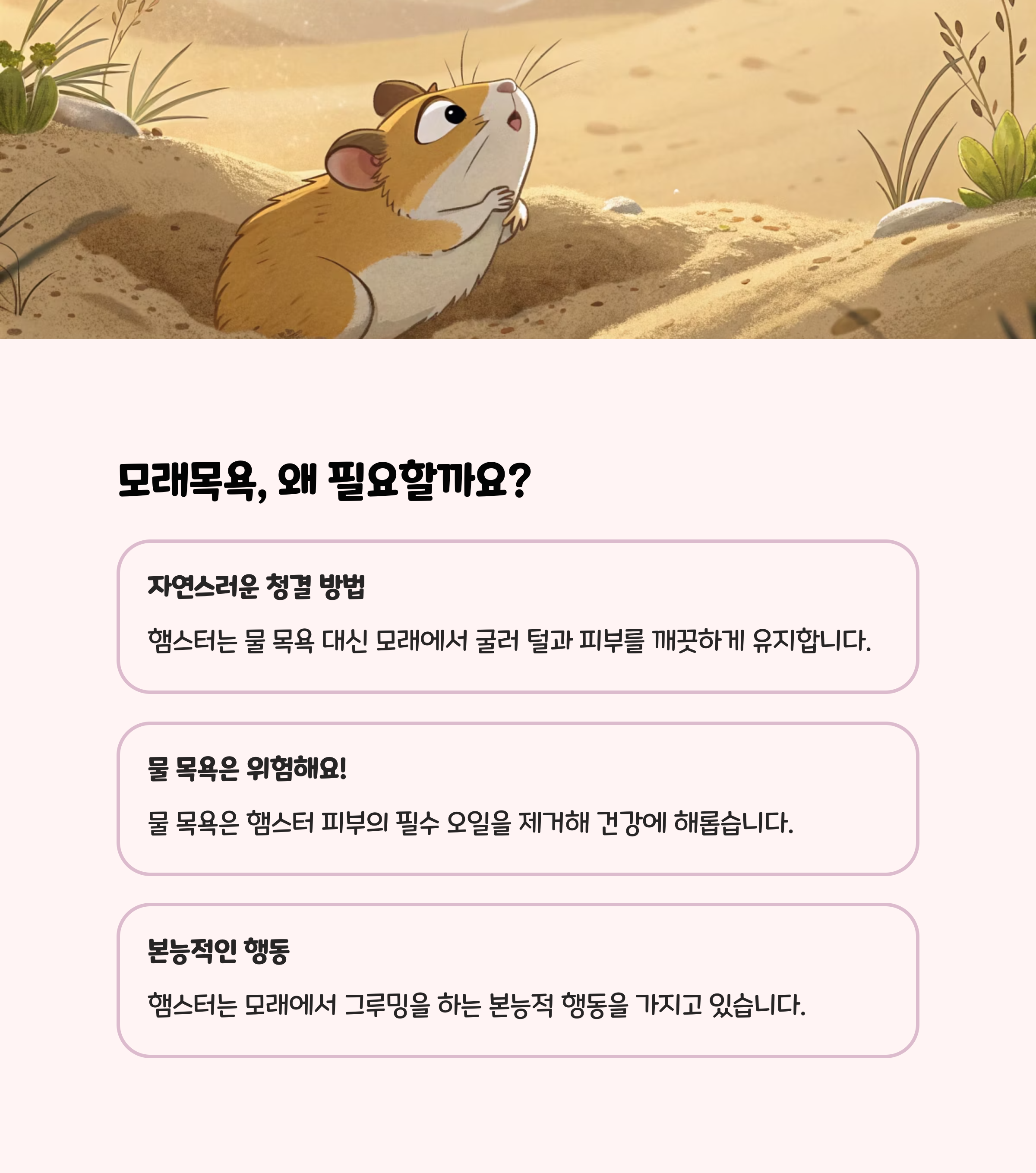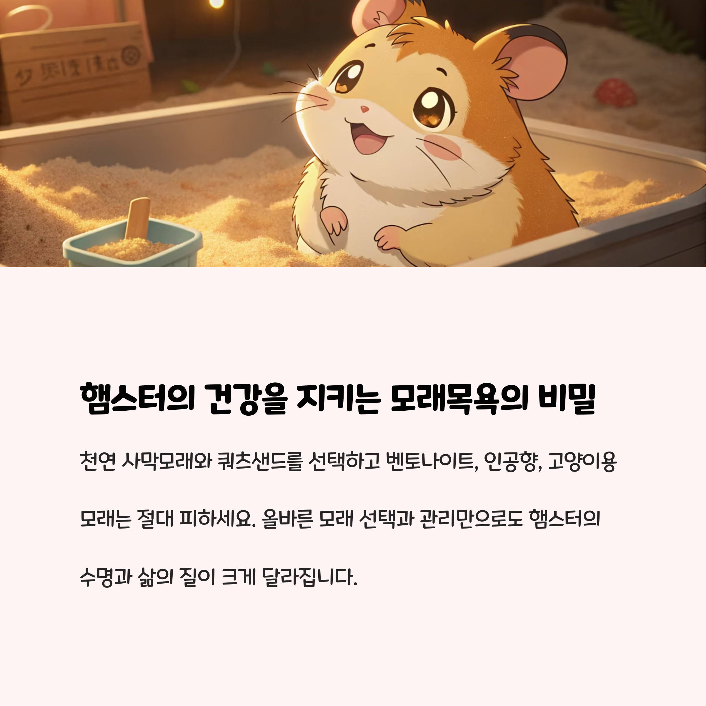 햄스터는 원래 건조한 사막 환경에서 살아온 동물로, 물로 씻기면 오히려 건강에 해가 되며 모래를 이용해 스스로 털을 관리합니다. 모래목욕은 피부병 예방, 스트레스 해소, 냄새 완화에 효과적입니다. 특히 드워프, 골든, 로보로브스키 등 종에 따라 필요한 모래 구역의 크기가 다르며, 드워프와 골든은 지름 20cm 이상, 로보로브스키는 케이지의 1/3 이상의 모래존이 권장됩니다.