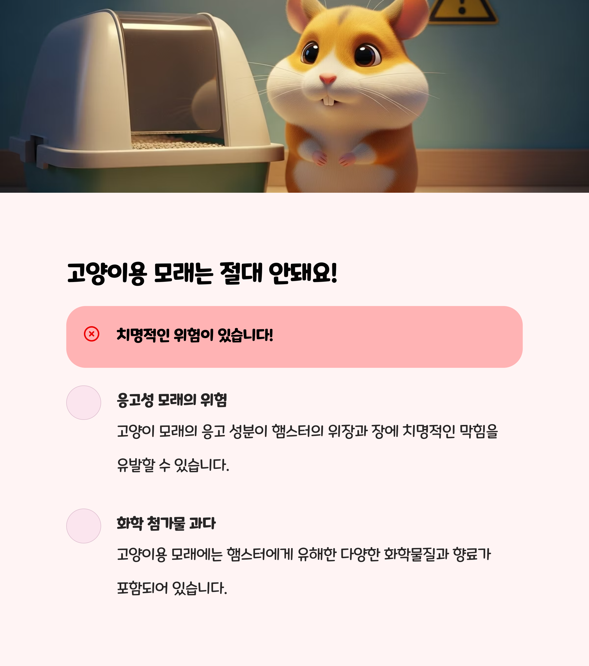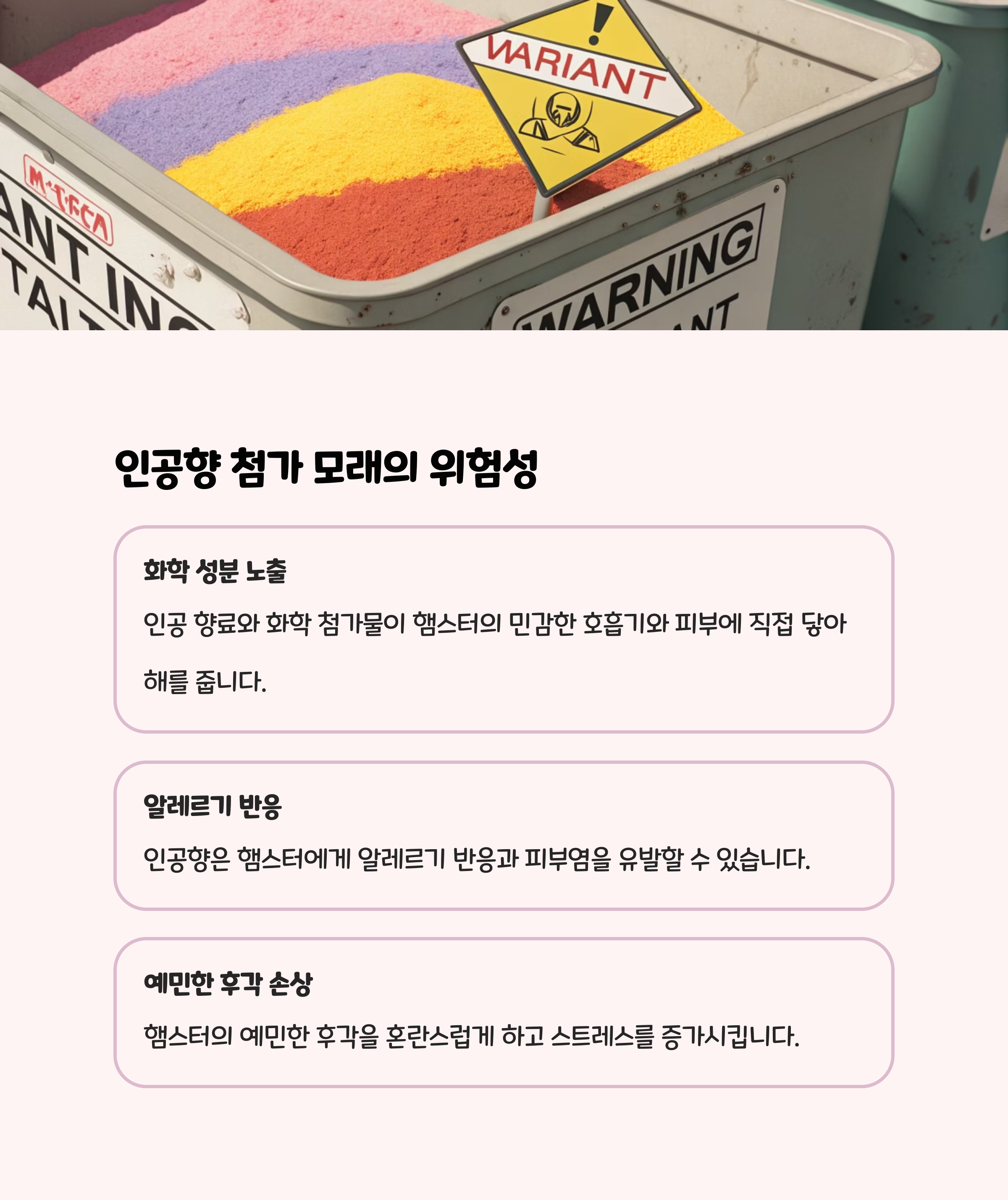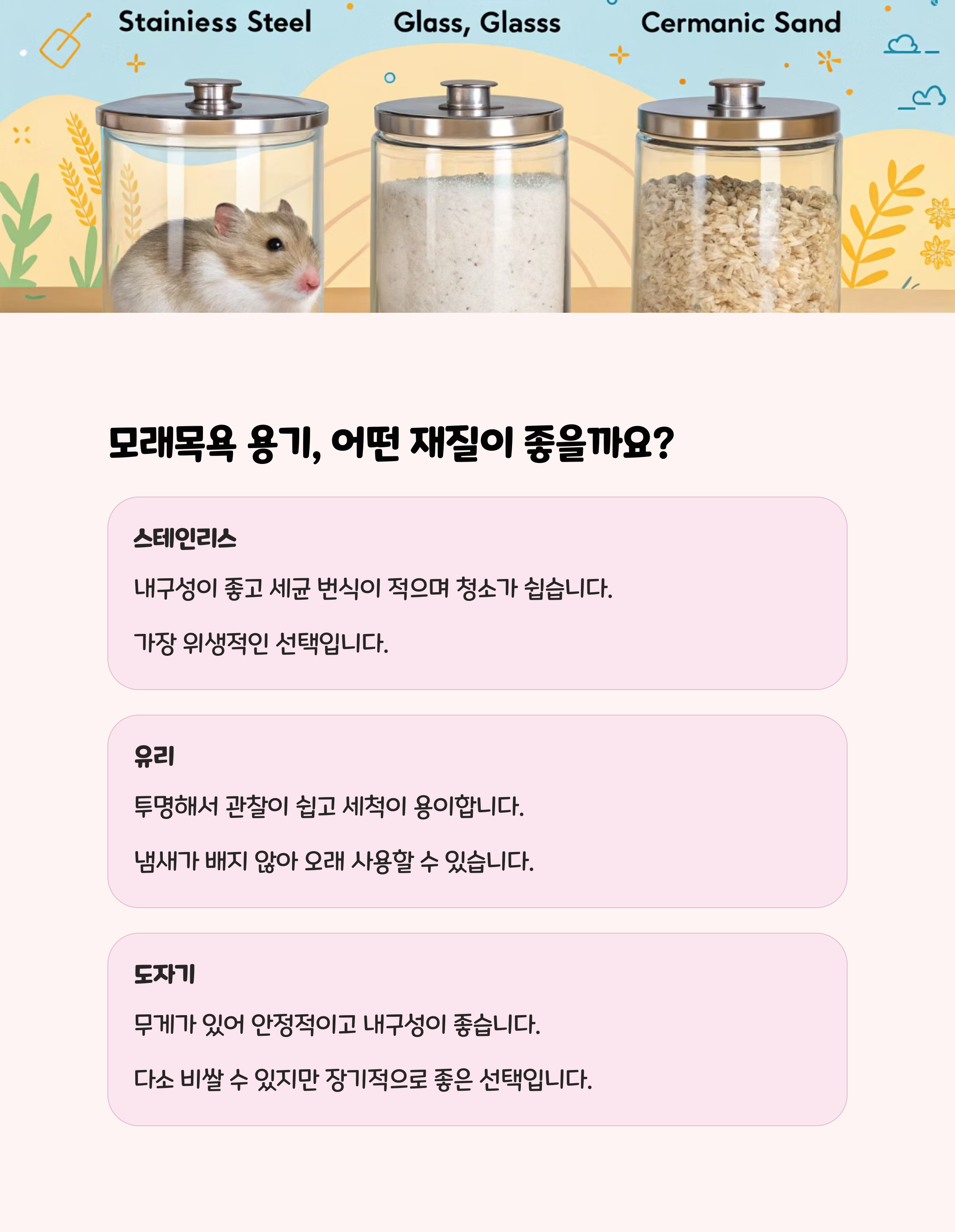 | 졸리 햄스터 목욕모래 | 인공향 모래 | 탈취 기능, 다양한 향 | 인공향, 장폐색 위험 |