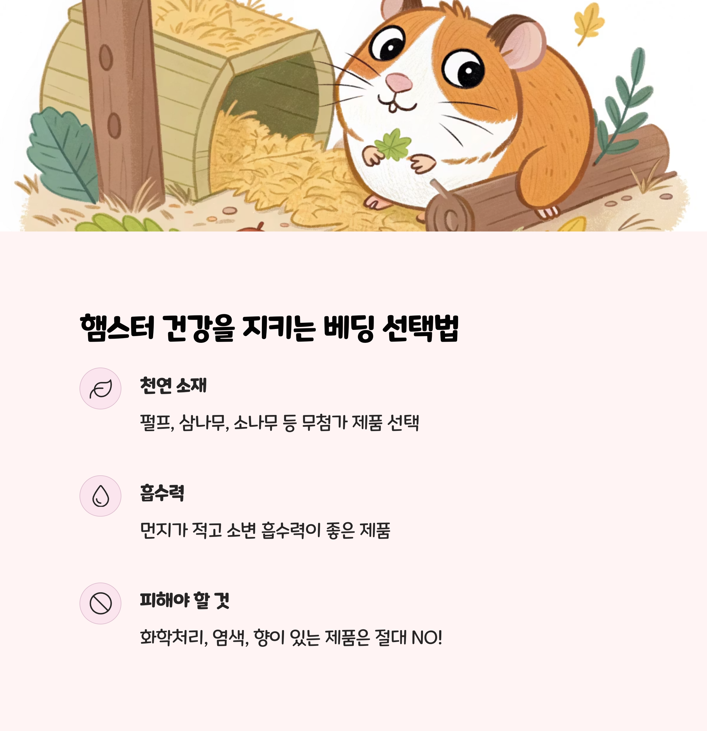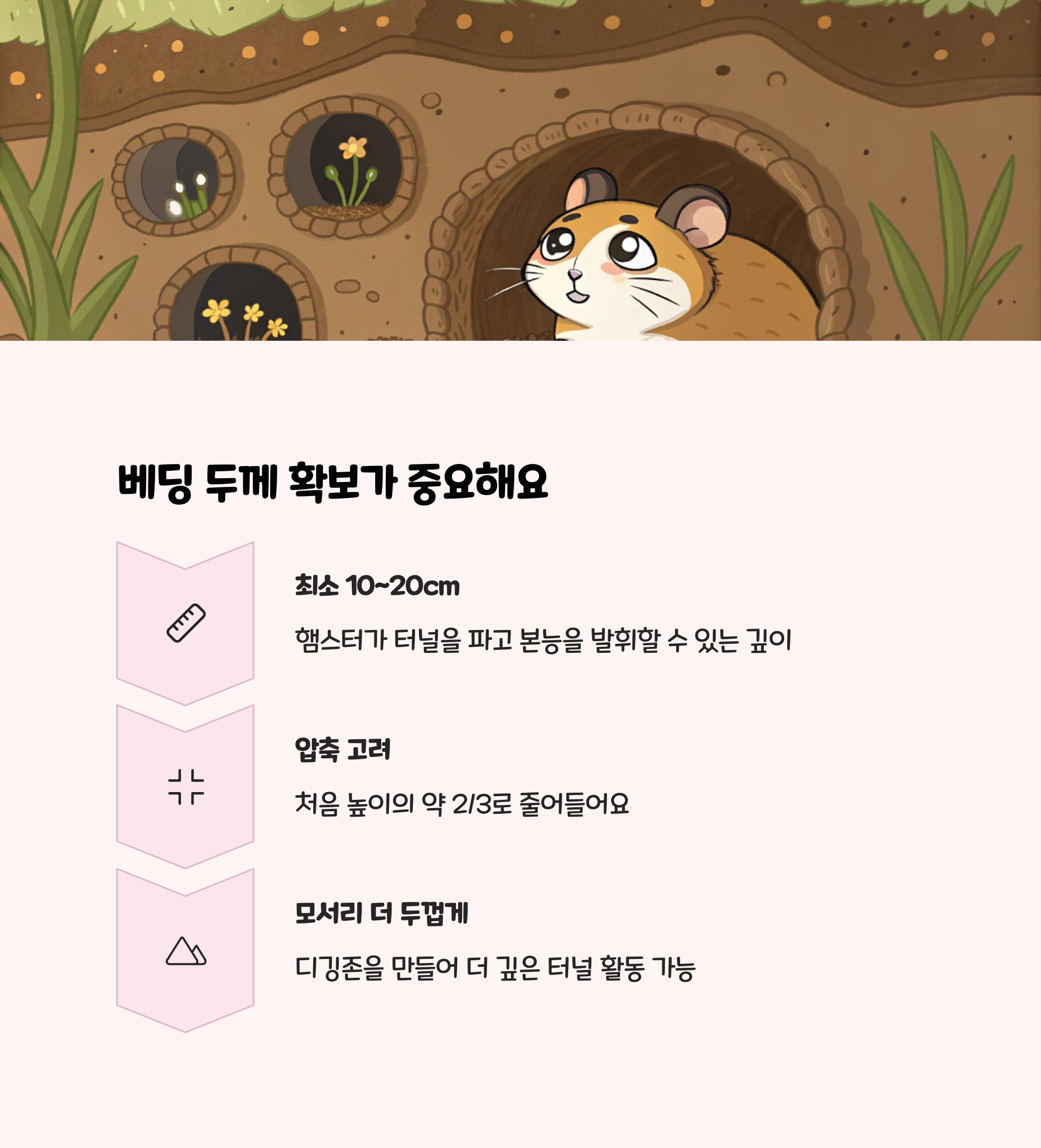 - 베딩 높이를 충분히 확보해주면 햄스터가 굴을 파며 자연스러운 행동을 할 수 있습니다.