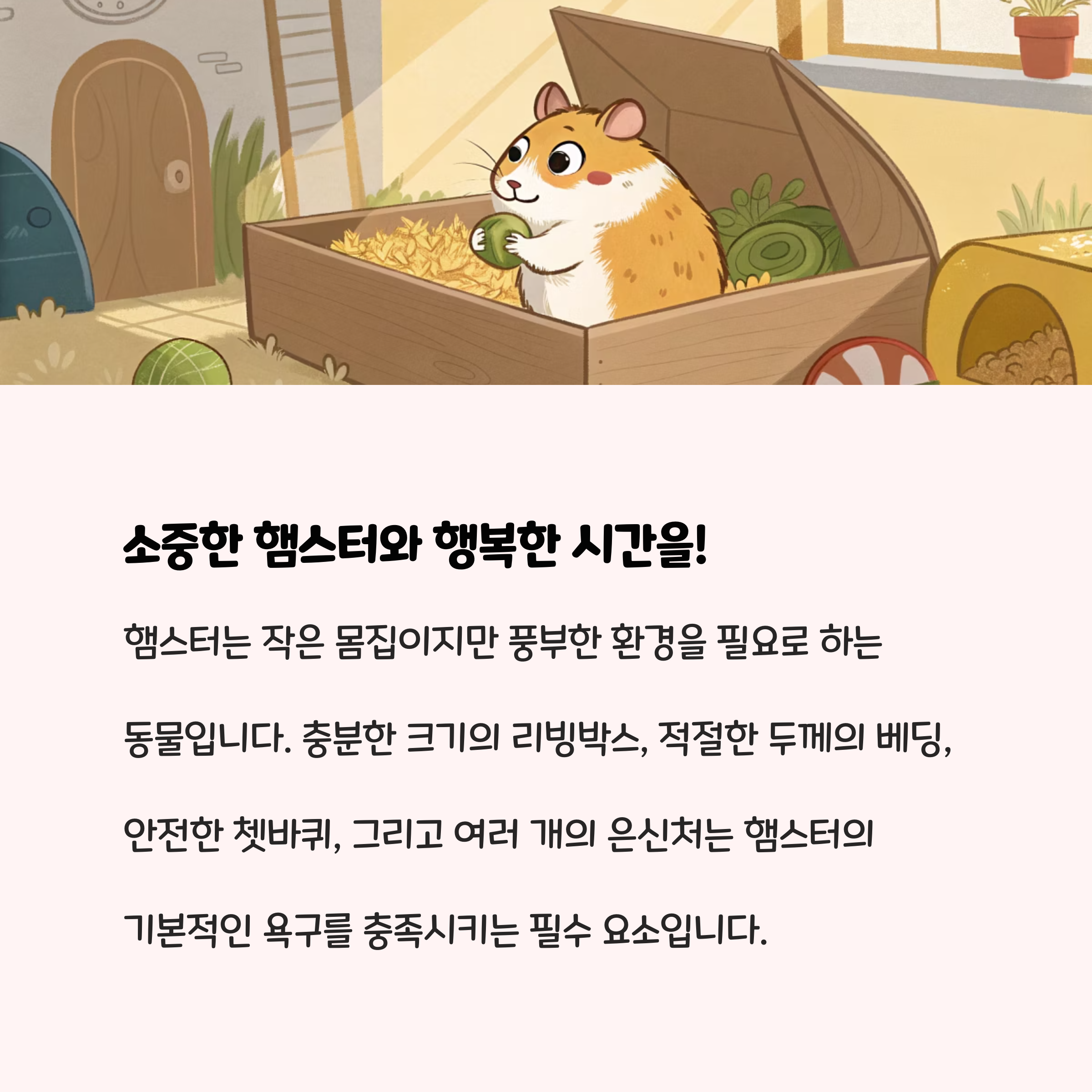 햄스터는 작고 귀엽지만, 충분한 공간과 올바른 환경이 반드시 필요합니다. 반려동물로 맞이한 만큼, 최소한의 지식과 정보를 갖추고 키워야 아이가 스트레스 없이 건강하게 살아갈 수 있습니다. 오늘 안내한 리빙박스 사육장 세팅법을 참고해 나만의 햄스터 하우스를 만들어 보세요. 햄스터가 행복해하는 모습을 보는 것이 집사에게도 큰 기쁨이 될 것입니다.