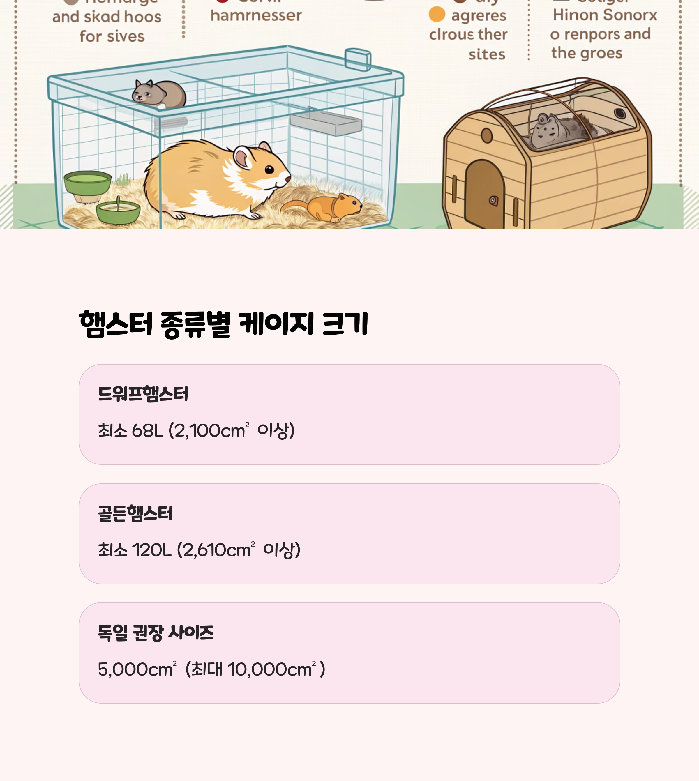 - 골든 햄스터: 최소 120L, 성체 기준 189L 이상 권장