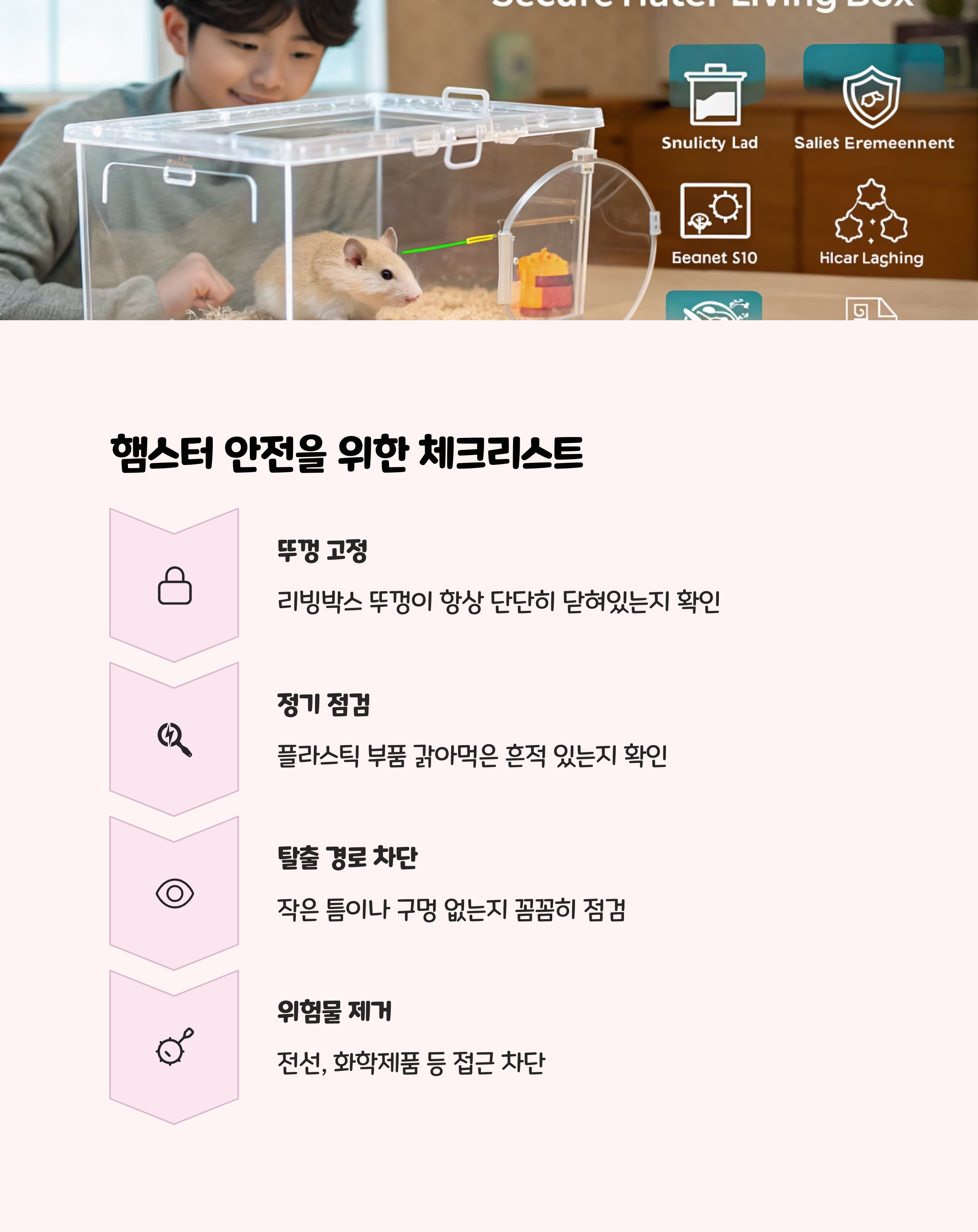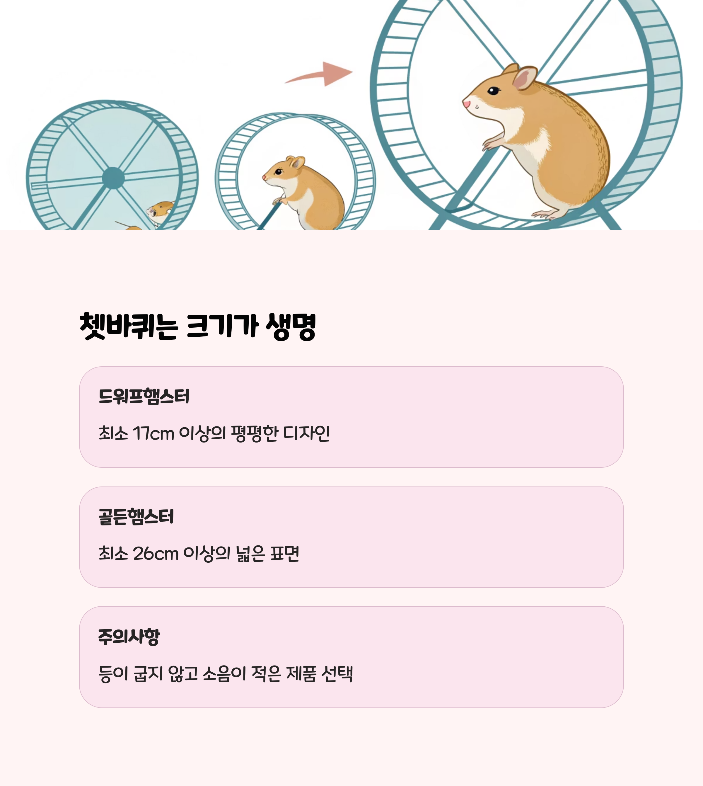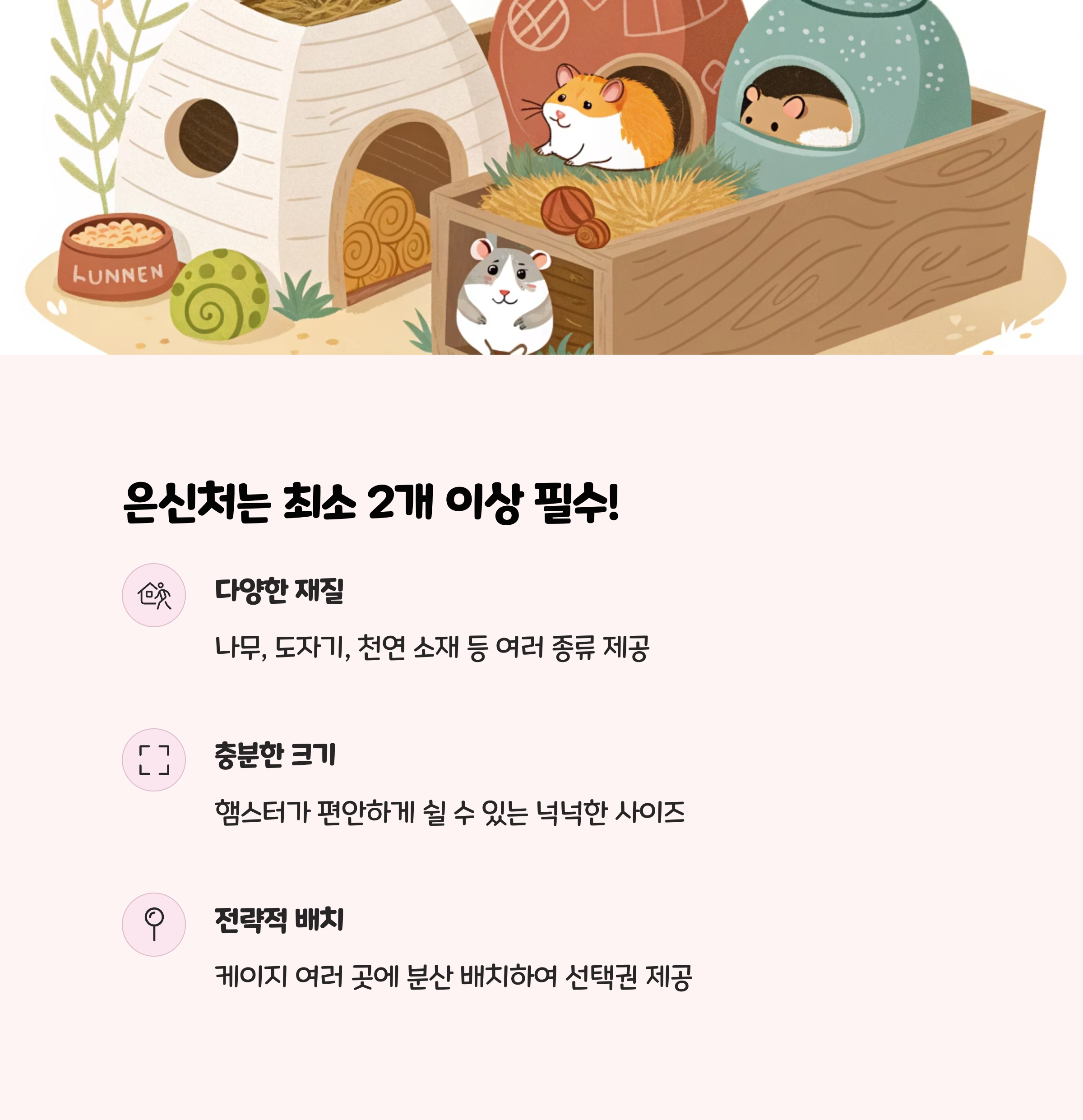 - 모래 목욕장, 은신처, 쳇바퀴, 터널 등 다양한 구조물을 배치하면 햄스터의 탐색 본능과 스트레스 해소에 좋습니다.