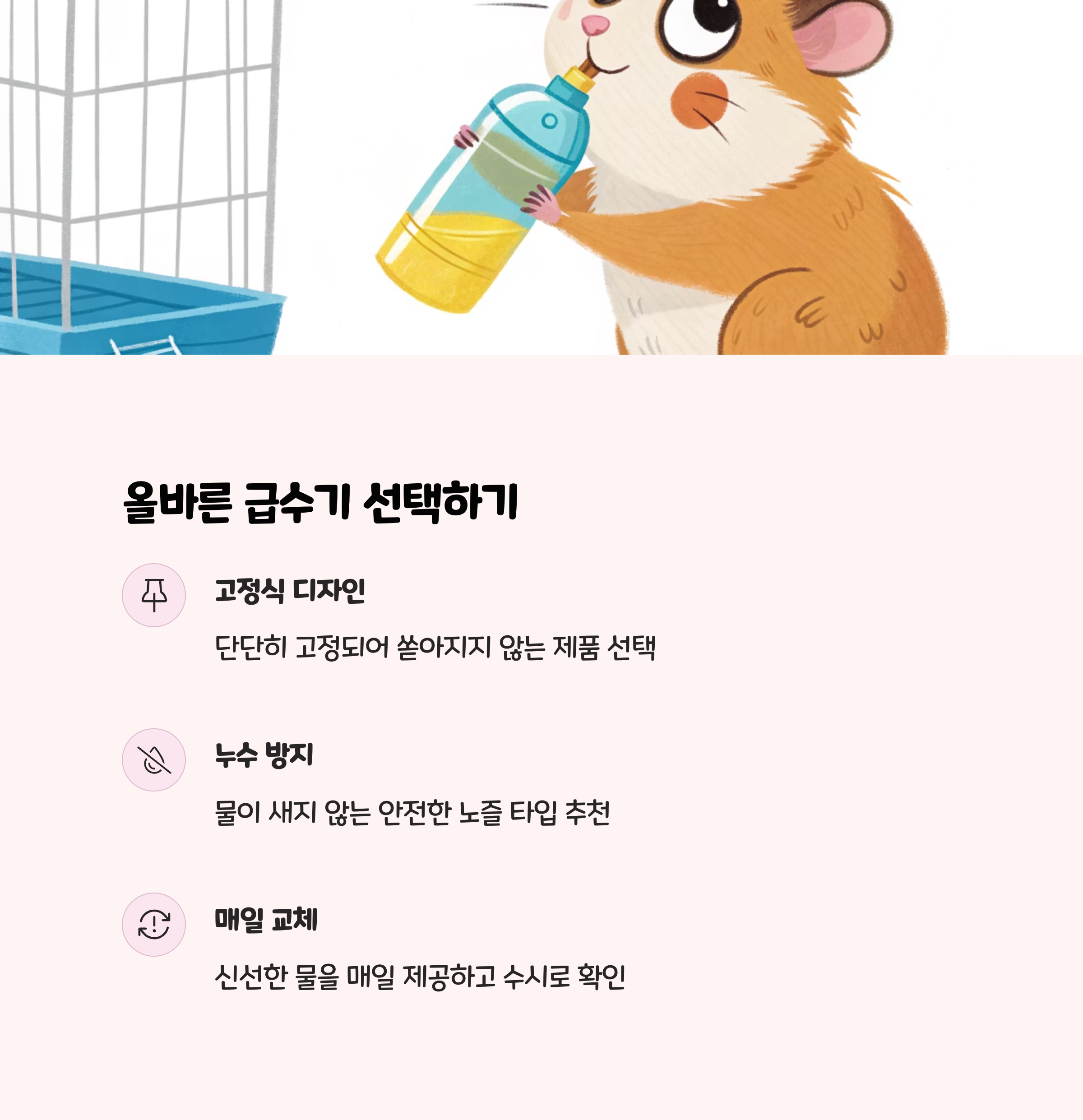 - 물그릇은 매일 신선한 물로 교체, 청소가 쉬운 제품 선택