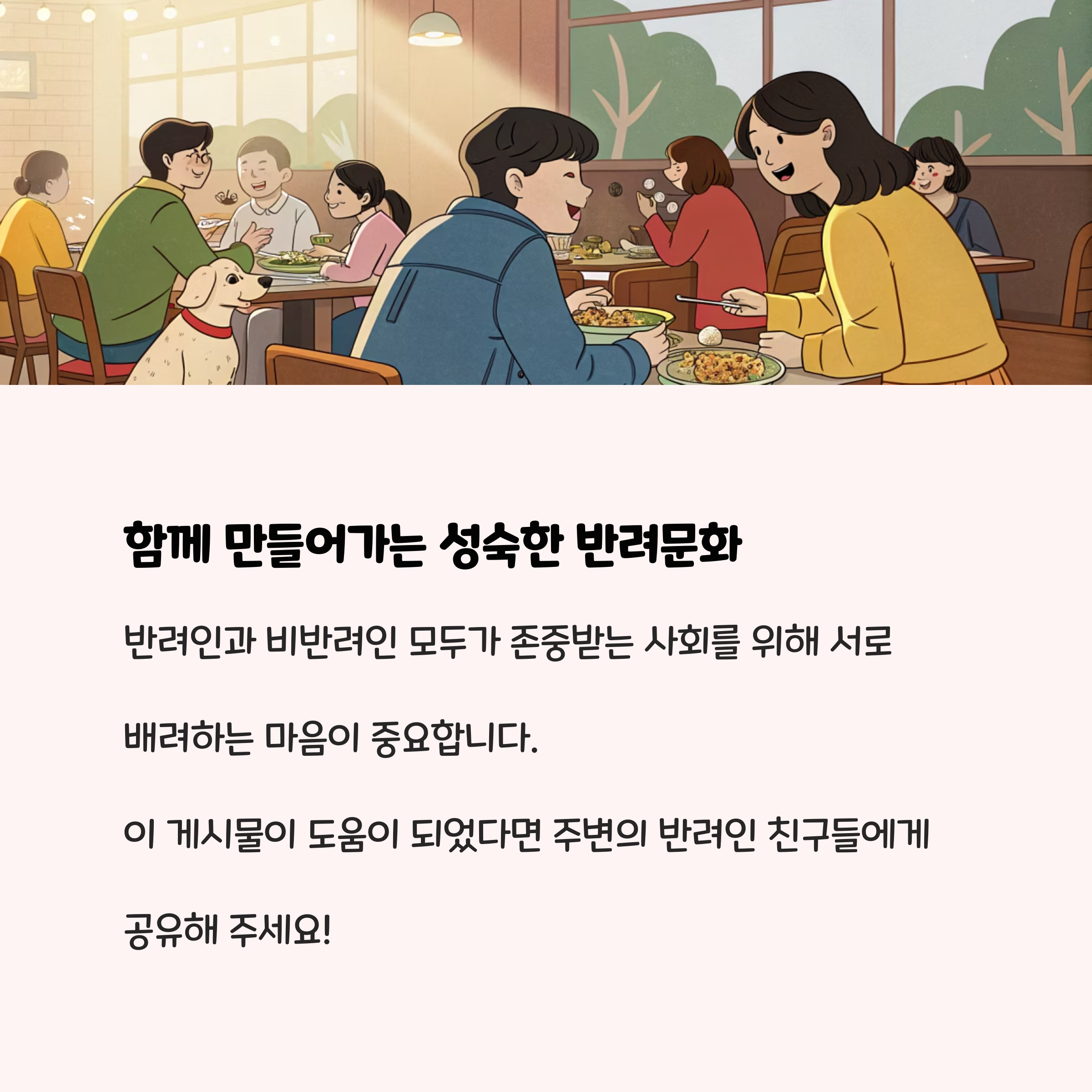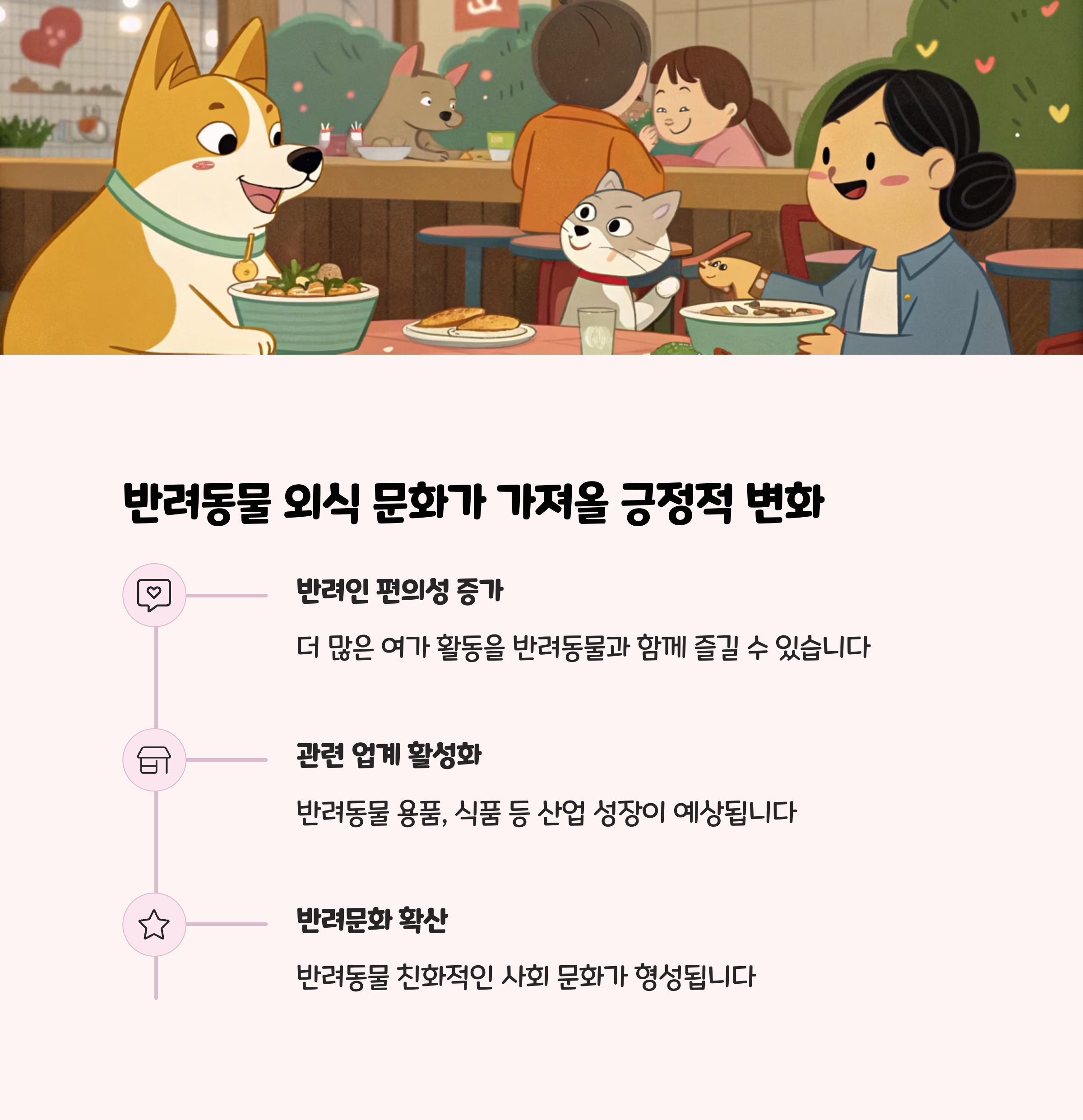 모든 이해관계자의 배려와 협력이 필요합니다. 음식점 업주는 위생과 안전을 최우선으로 준비하고, 반려인은 기본예절을 지키며, 비반려인 손님에 대한 배려도 잊지 않아야 합니다. 정부와 지자체는 지속적인 점검과 관리, 그리고 사회적 합의를 통해 새로운 문화를 정착시켜야 할 것입니다.