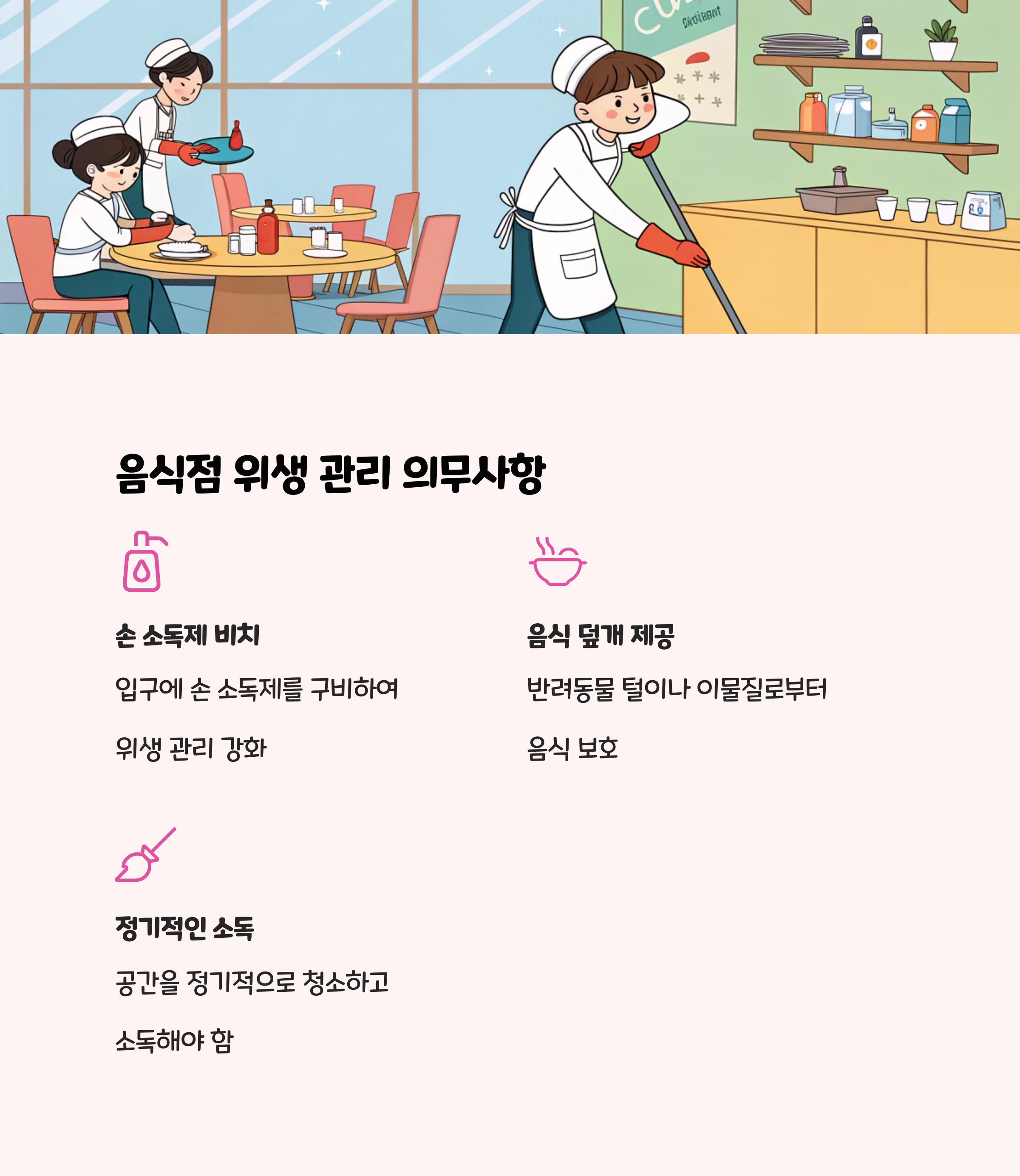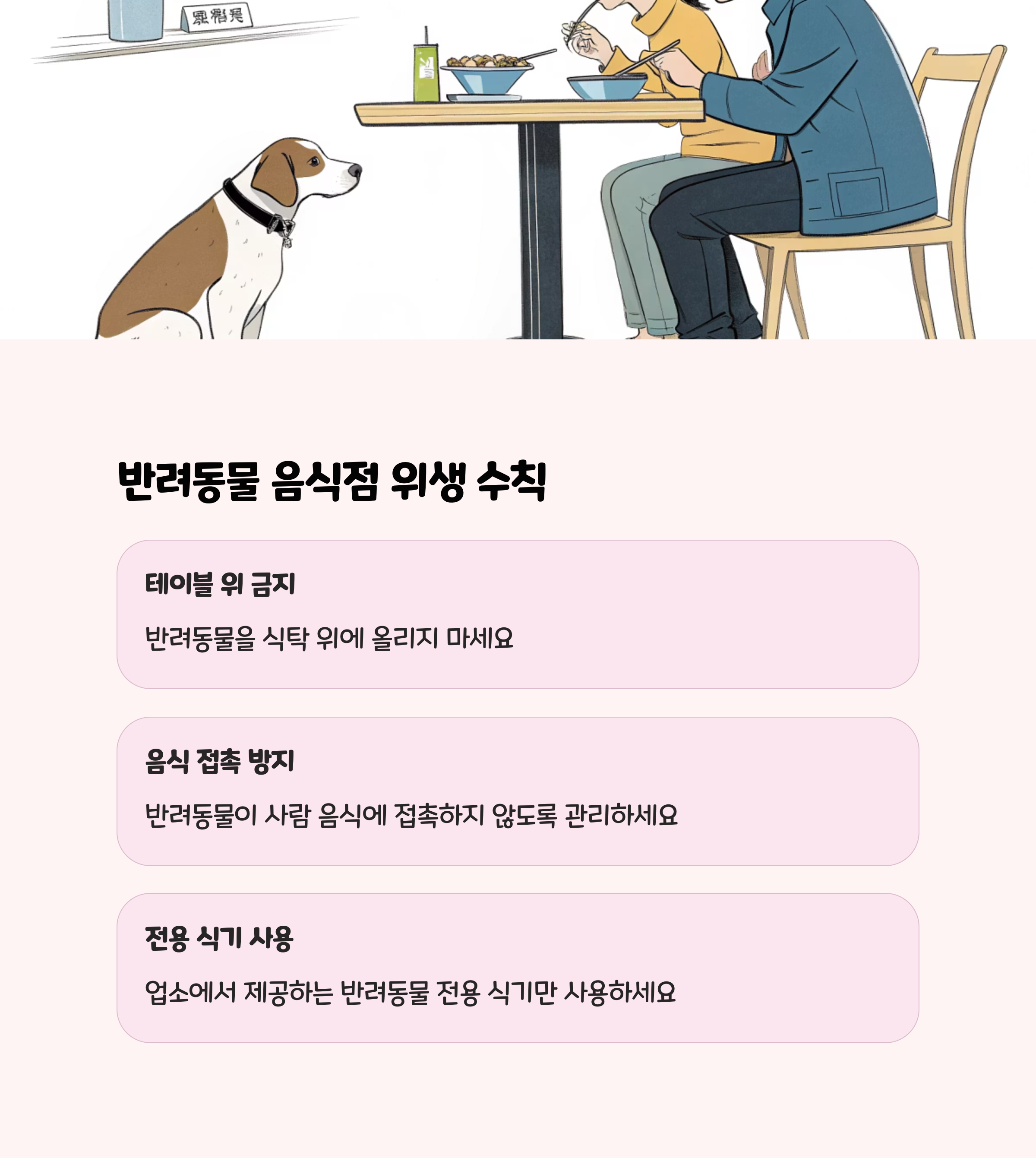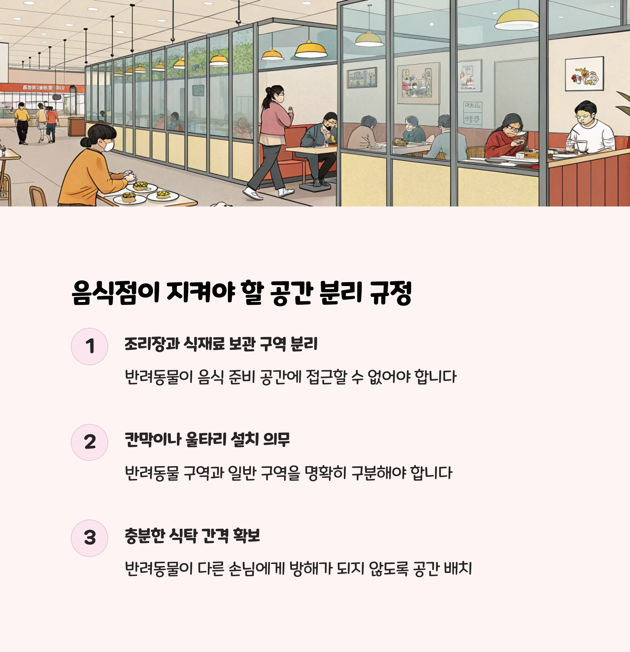 공간 분리: 조리실, 식재료 보관창고 등 식품 취급 구역과 반려동물 동반 구역을 칸막이나 울타리로 명확히 분리해야 합니다.위생 관리: 음식 진열 시 반드시 덮개를 사용해 동물의 털 등 이물질 혼입을 방지해야 하며, 반려동물 전용 식기와 사람용 식기를 구분해 사용해야 합니다.안전장치: 목줄 고정 장치, 반려동물 전용 의자·케이지, 손 소독제 등 위생·안전 용품을 반드시 구비해야 합니다.출입 안내: 업소 입구와 출입문에 ‘반려동물 동반 가능’ 표시와 이용 수칙을 명확히 게시해야 하며, 알레르기 유발 가능성 등도 안내해야 합니다.정기 점검: 자체적으로 위생·안전관리 상태를 매월 점검하고, 사고 발생 시 즉시 식약처에 보고해야 합니다.