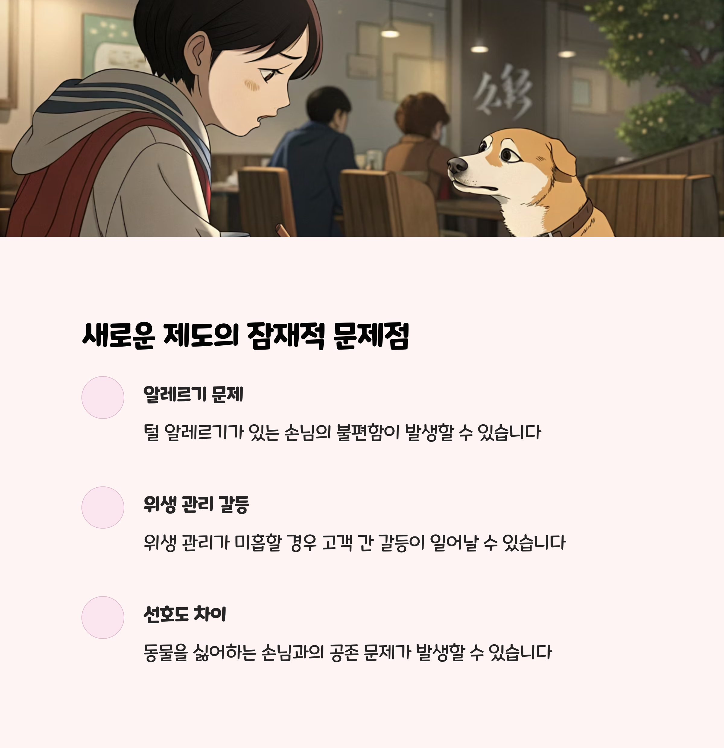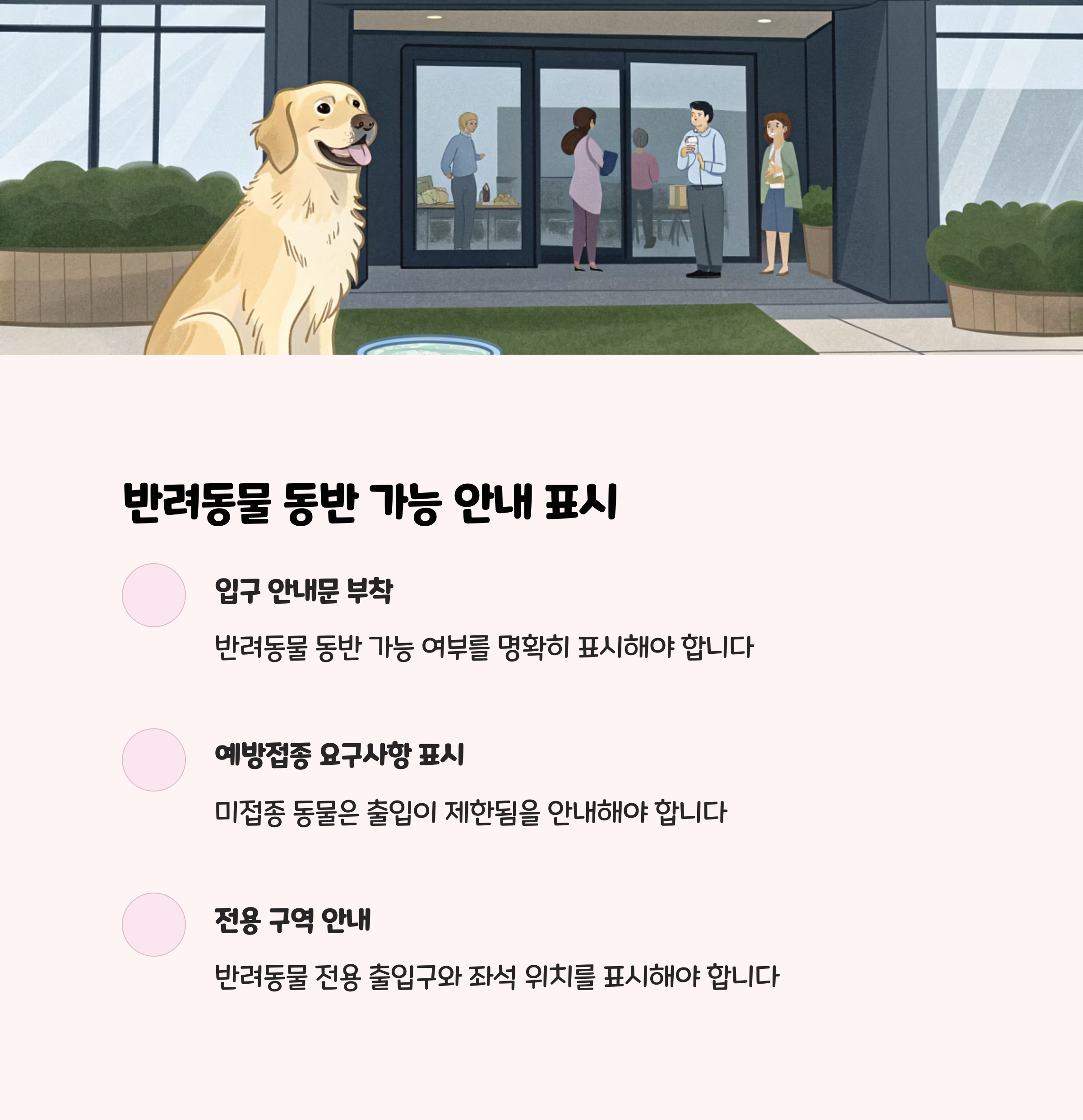 업소는 반려동물 동반 가능 사실을 명확히 안내해야 하며, 알레르기 등 건강상 우려가 있는 손님은 입장 전에 안내문을 확인해야 합니다. 만약 피해가 발생하면 업소와 협의하거나, 필요시 보건당국에 신고할 수 있습니다.