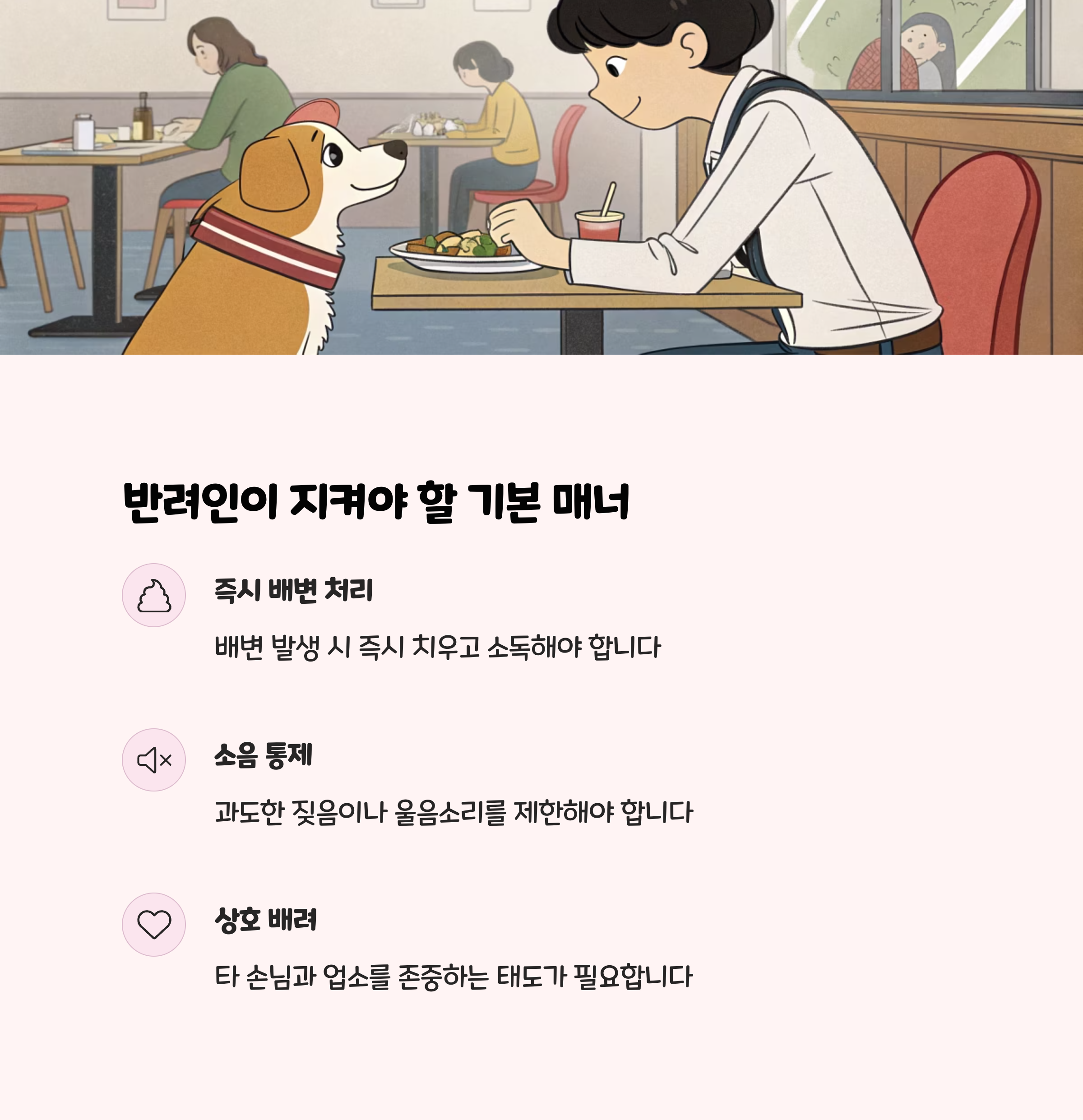 예방접종 증명: 강아지(또는 고양이)는 반드시 예방접종을 완료하고, 증명서를 지참하는 것이 권장됩니다.기본예절:목줄 착용, 케이지 사용 등 기본 안전수칙을 지키고, 다른 손님에게 불편을 주지 않도록 주의해야 합니다.배변 관리: 반려동물의 배변은 보호자가 직접 책임지고 즉시 처리해야 하며, 업소의 이용 수칙을 철저히 준수해야 합니다.출입 제한 동물: 맹견 등 일부 견종은 업소의 정책에 따라 출입이 제한될 수 있습니다.
